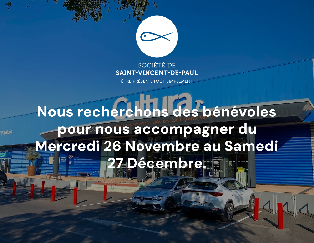 Nous recherchons des bénévoles pour nous accompagner du Mercredi 26 Novembre au Samedi 27 Décembre.